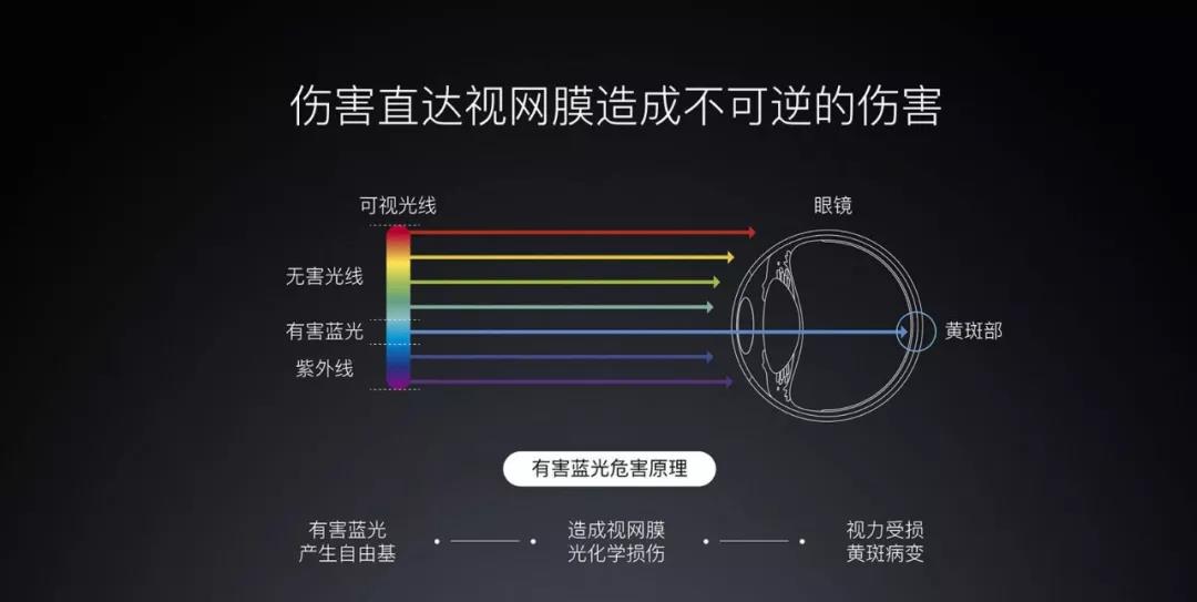 高能短波蓝光能够穿透晶状体直达视网膜,引起视网膜色素上皮细胞的萎缩甚至死亡,光敏感细胞的死亡将会导致视力下降甚至完全丧失,而且这些损伤是不可逆的。家用液晶电视、学校教学用的液晶、投影机等多媒体设备、手机、平板电脑、LED照明设备……青少年长期接触这些短波蓝光光源,对视力健康造成极大的影响。